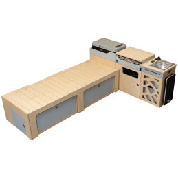 Kit aménagement amovible (2 grands tiroirs, plan de travail et un banc avec dossier rabattable), il transforme votre Ford Custom en un van life.