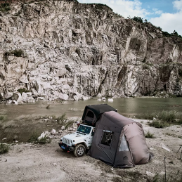 L'annexe de tente de toit Wild Land offre non seulement de l'espace pour se changer ou ranger équipements ou sacs, mais elle devient également un salon immense, la chambre de votre chien, l'entrée couverte indispensable dans certaines circonstances.