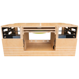 Le Kit d’aménagement Hive Box Omni Box XS possède un plan de travail, 2 compartiments fermés avec cloisons amovibles et 1 espace de rangement central ouvert.