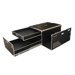 Kit aménagement amovible comprenant : un plan de travail, 2 compartiments fermés et 1 rangement central ouvert, divers accessoires sont à ajouter dans la liste ci-dessous. Cette malle de voyage amovible est conçue pour dormir, cuisiner et bivouaquer en toute simplicité.