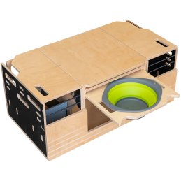 Kit aménagement amovible comprenant : un plan de travail, 2 compartiments fermés et 1 rangement central ouvert, divers accessoires sont à ajouter dans la liste ci-dessous. Cette malle de voyage amovible est conçue pour dormir, cuisiner et bivouaquer en toute simplicité.