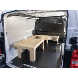 Lit peigne en kit à assembler, conçu pour l’aménagement de vans et fourgons. Fabriqué en contreplaqué de peuplier brut, il comprend : une structure robuste et légère, un système d’ouverture type lit peigne, un espace de rangement ouvert sous le sommier.Â