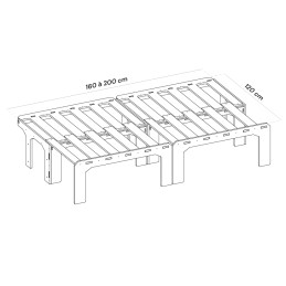 Le lit mesure 190 cm de long et 120 cm de large déplié (60 cm + 60 cm). Le matelas adapté au sommier (en option) est à sélectionner dans le menu déroulant.