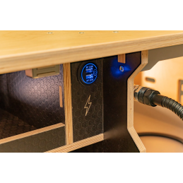 Le côté gauche de la box accueille les 2 bidons (2x12L), un chargeur USB avec rallonge allume cigare ainsi que d’un petit rangement.