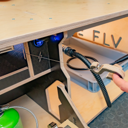 Le Kit d’aménagement Hive Box Sea Mini possède 2 plateaux modulables soit en structure de lit ou en plan de travail extérieur, 1 corde à linge, 1 espace de rangement, 2 prises USB 12V, 2 bidons de 12 litres chacun, la douchette amovible et sa pompe immergée.