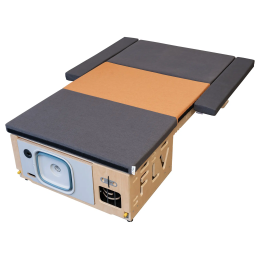 Le grand tiroir de cuisine se déploie vers l’arrière, il est équipé de 2 glissières résistant à des charges lourdes. À l’intérieur de ce tiroir il est possible d’ajouter l’option eau (1x 10L et 1x 12L, un évier, la douchette…), le frigo de 15 litres et/ou le réchaud à gaz 1 feu (cartouche à visser non fournie). Â