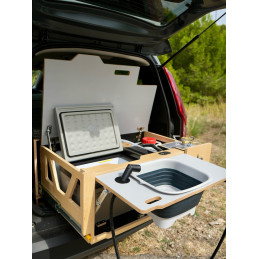 Kit aménagement amovible (grand tiroir de cuisine et plan de travail), Cette box convertit votre Dacia Logan Break en un mini camping-car.