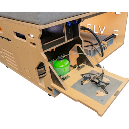 Le Kit d’aménagement Hive Box Sea Mini possède 2 plateaux modulables soit en structure de lit ou en plan de travail extérieur, 1 corde à linge, 1 espace de rangement, 2 prises USB 12V, 2 bidons de 12 litres chacun, la douchette amovible et sa pompe immergée.