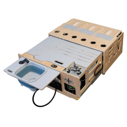 En seulement 5 minutes ce kit d’aménagement amovible s’installe très facilement sans outils dans votre véhicule de tous les jours. Cette box convertit votre véhicule en un mini camping-car.