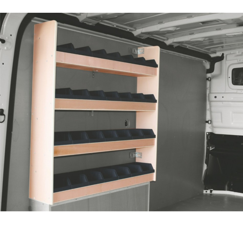 Le casier en bois avec bacs est fabriqué en contreplaqué de 15 mm et son vernis incolore, teinté Okoumé ou gris clair à choisir dans le menu déroulant offre plusieurs fonctionnalités. Il est équipé de 4 étagères et de 40 bacs moyens inclus. Ce meuble s'adapte parfaitement au Nissan Primastar L2 à partir de Novembre 2021 et est à fixer sur le côté arrière gauche. Le choix du vernis est à choisir dans le menu déroulant.