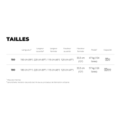 Dimensions Intérieures : hauteur max 120 cm, largeur max 180 cm, longueur max 220 cm