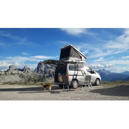 Elle se fixe à l’aide de 6 pattes directement sur les barres de toit grâce à ses deux rails intégrés. Une échelle en aluminium de 241 cm avec marche antidérapantes est incluse. L’échelle est fournie avec une toile en PVC de rangement évitant l’eau et la sable dans la tente une fois replié.