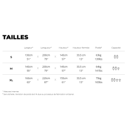Dimensions extérieur replié : 200 cm de large sur 132 cm de long par 30 cm de haut (tente fermée)