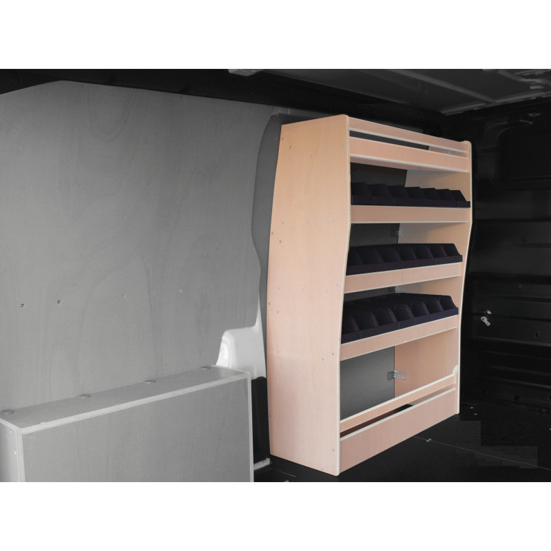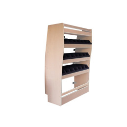 Le casier bois avec bacs de rangement est fabriqué en contreplaqué de 15 mm et son vernis incolore, teinté Okoumé ou gris clair à choisir dans le menu déroulant offre plusieurs fonctionnalités. Il est équipé de 4 étagères avec 15 bacs inclus et de 2 bandeaux amovibles. Ce meuble s'adapte parfaitement à l'Opel Vivaro L1 à partir de 2019 et est à fixer sur le côté avant gauche. Le choix du vernis est à choisir dans le menu déroulant.